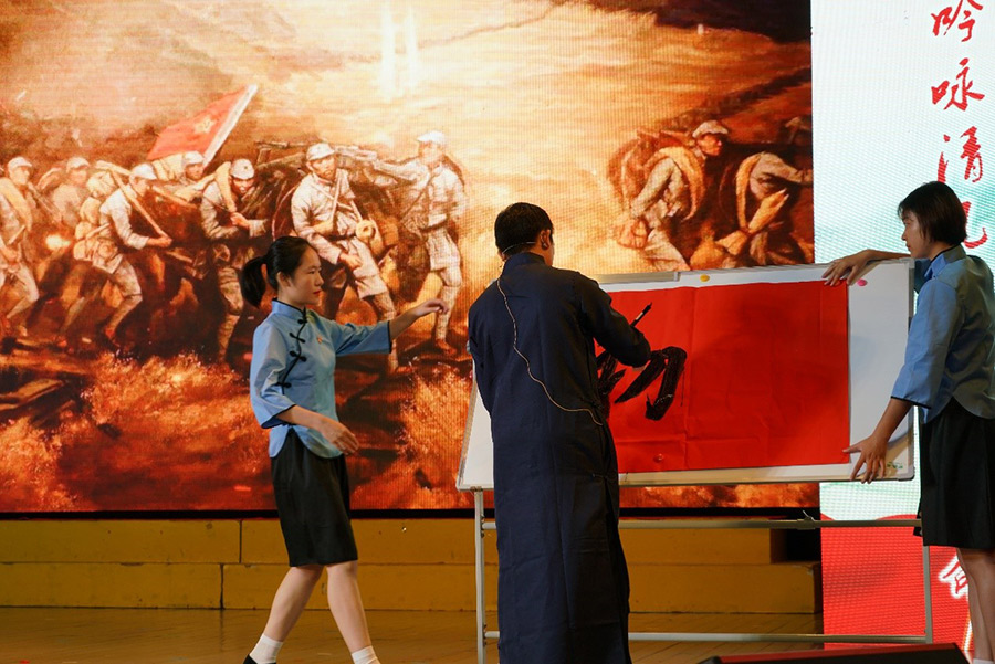 新城投資集團黨支部四名黨員朗誦的詩歌《不忘初心,牢記使命,我們永遠在路上》,節目形式新穎,選手語言真摯,富有感染力地回顧黨的光輝歷程,謳歌黨的豐功偉績和改革開放40年來取得的偉大成就,或深情款款、或激情高昂的精彩誦讀引起了在場觀眾的心靈共鳴,掌聲不斷。黨員譚佳璐在現場用毛筆書寫了“不忘初心,牢記使命”八個大字,表達了黨員們樹立遠大的理想、力爭上游、為祖國的強盛貢獻力量的決心。