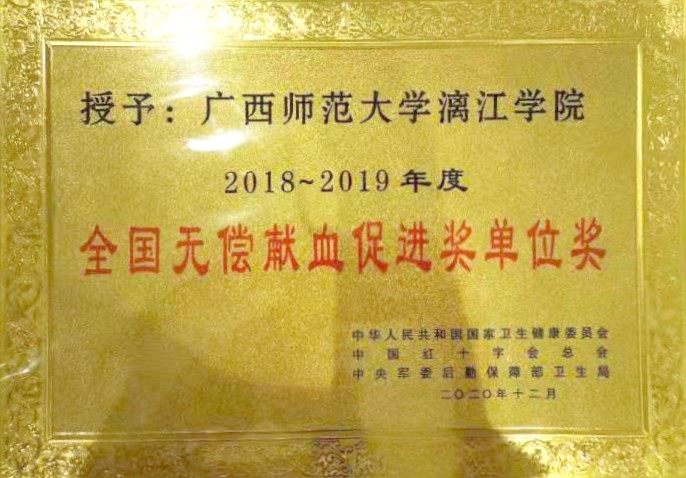 6月9日,由桂林市獻血委員會、桂林市衛生健康委員會、桂林市紅十字會、中國人民解放軍聯勤保障部隊桂林聯勤保障中心衛勤處主辦,桂林市中心血站、廣西師范大學漓江學院承辦的“喜迎建黨100周年桂林市慶祝2021年世界獻血者日無償獻血表彰文藝匯演”活動在漓江學院召開。漓江學院獲得全場唯一“全國無償獻血促進獎單位獎”。